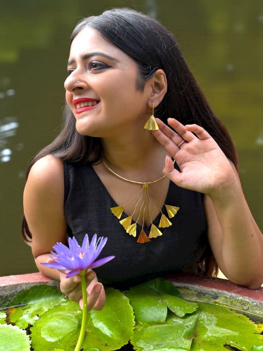 Dancing Lilies Brass Hasli Necklace Jewelry Set (Necklace + Earrings)