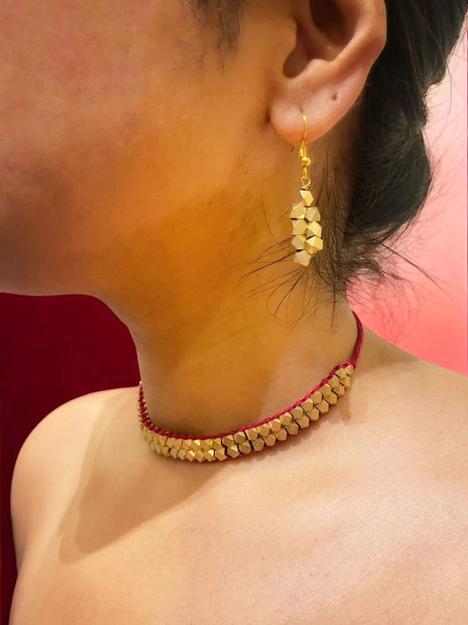 Flat Beaded Brass Choker Necklace Jewelry Set - Red
