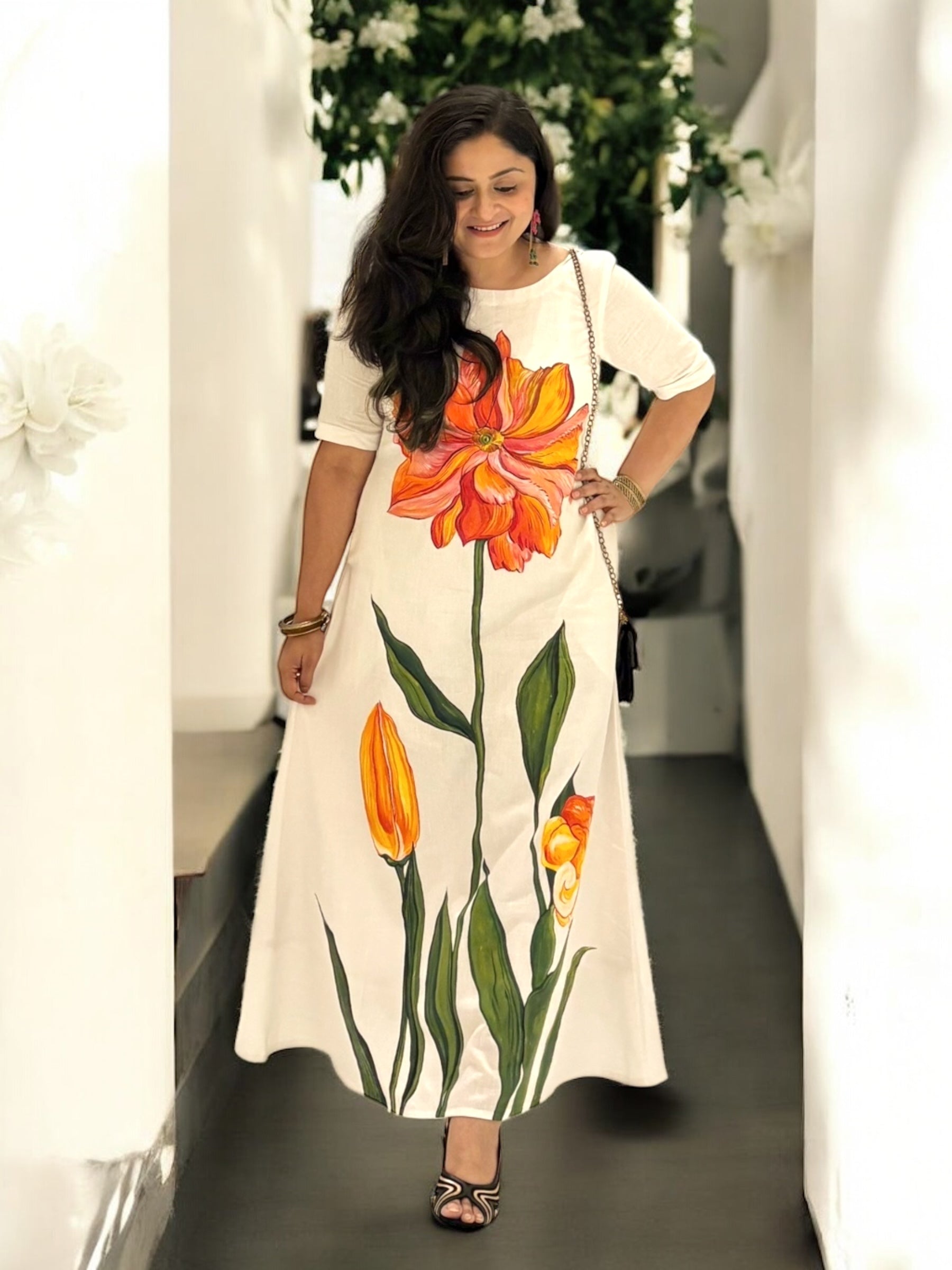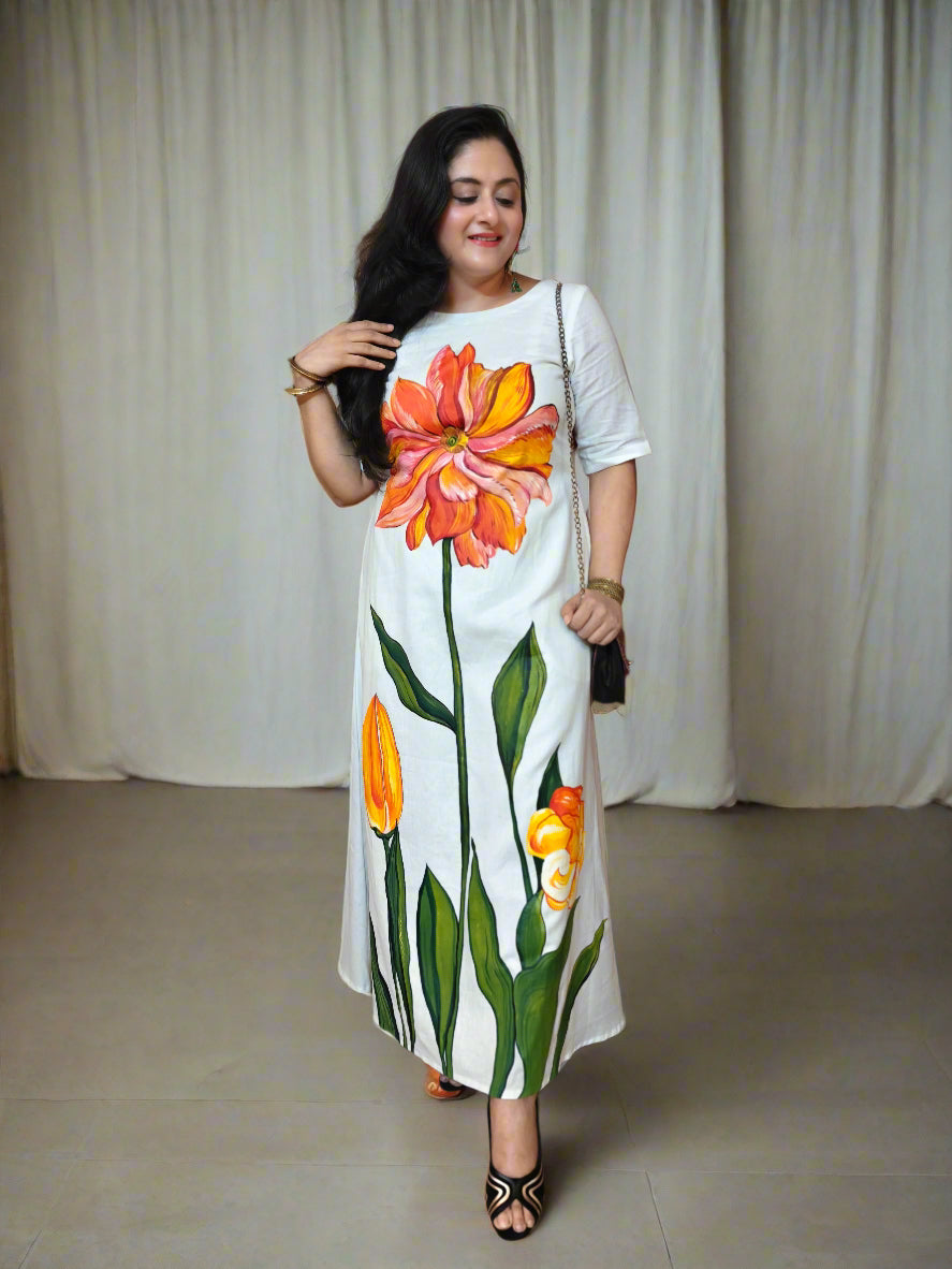 The Anastasia Floral Handpainted Long Cotton Dress in white features delicate glass sleeves and intricate handpainted floral designs. Made from soft, breathable cotton, this elegant dress offers a refined silhouette that blends artistic detail with comfortable wear, ideal for sophisticated occasions.