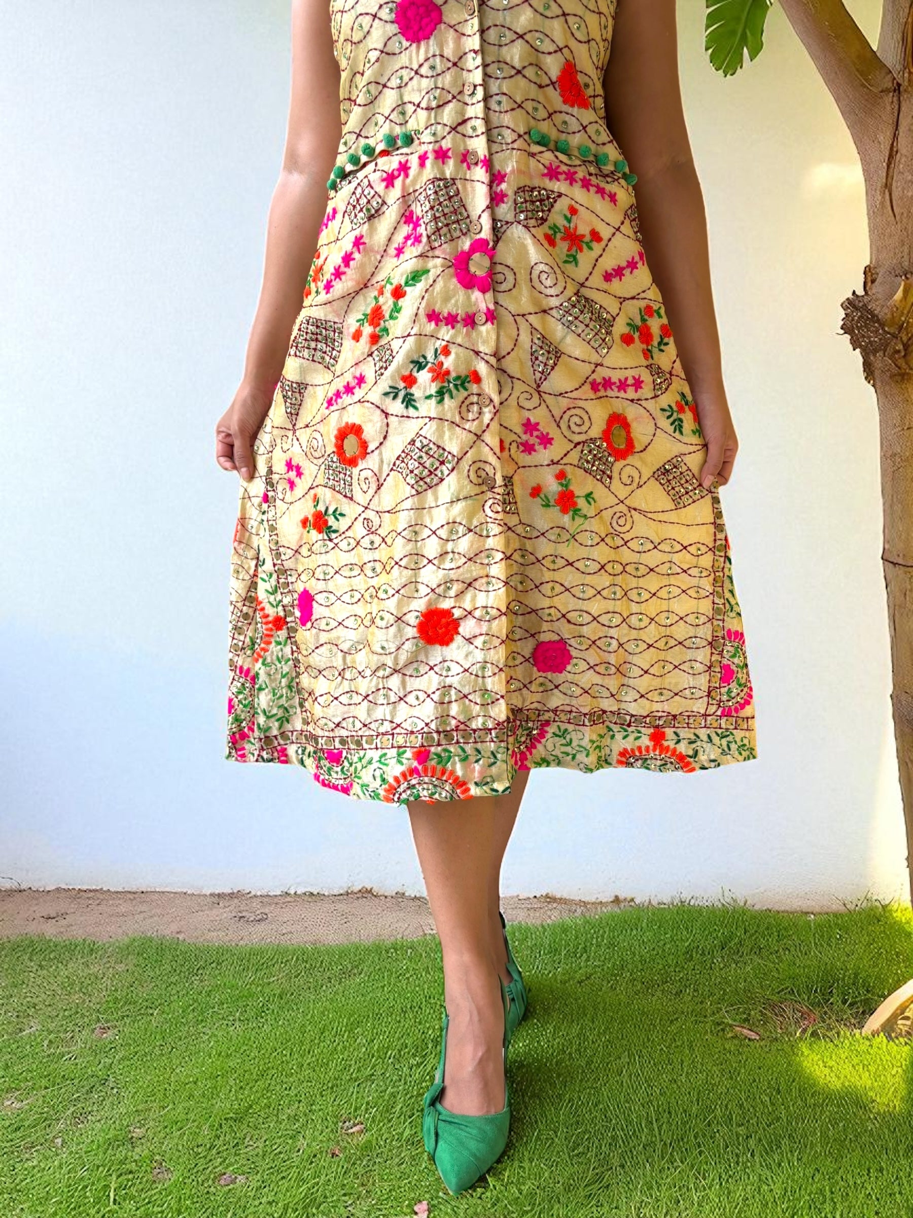 Discover the beauty of traditional Indian craft with our Butterfly Wings Embroidered Phulkari A-line Dress. Made with intricate embroidery, this dress will make you stand out in any occasion. Made from high-quality fabric, it offers both comfort and style, making it a must-have for your wardrobe.