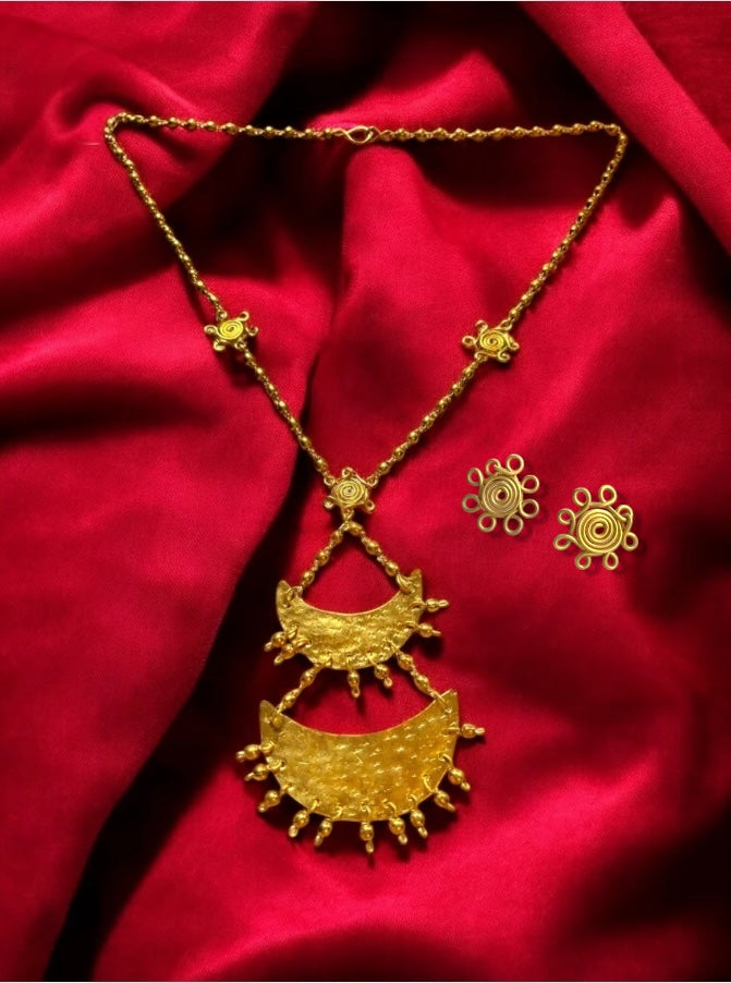 Elevate your elegance with the Dwitiya Chandni Moon Brass Long Pendant Chain Necklace Jewelry Set. This sophisticated set features a beautifully crafted long brass pendant necklace paired with matching earrings, designed to add a timeless charm to any outfit. Perfect for both formal occasions and everyday wear, it offers a graceful blend of classic style and modern appeal.