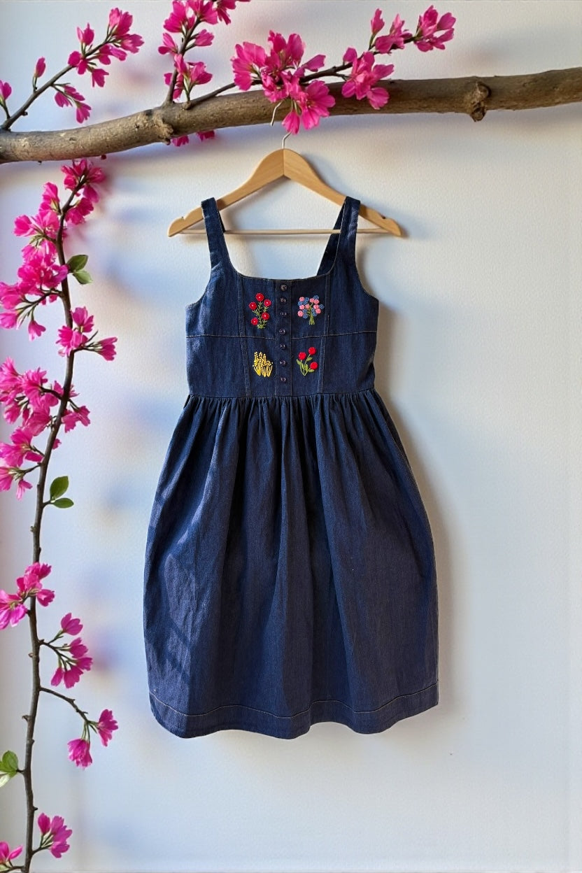Slip into effortless charm with the Fiore Hand-Embroidered Strappy Denim Dress in Blue. This playful piece features delicate hand-embroidered details that transform classic denim into wearable art. The adjustable straps offer a customizable fit, while the timeless blue wash pairs perfectly with everything in your wardrobe. Whether you're dressing up for a night out or keeping it casual, Fiore brings personality and comfort to your everyday style. A versatile staple that celebrates handcrafted beauty.