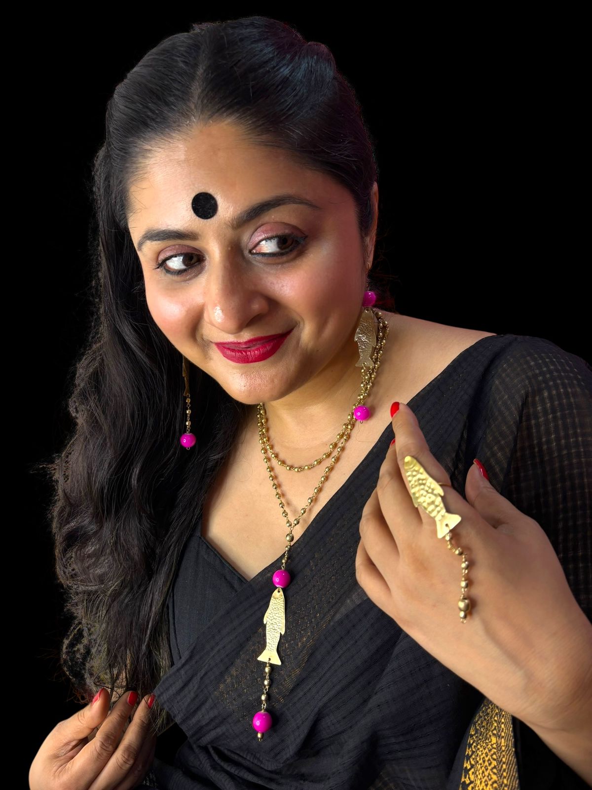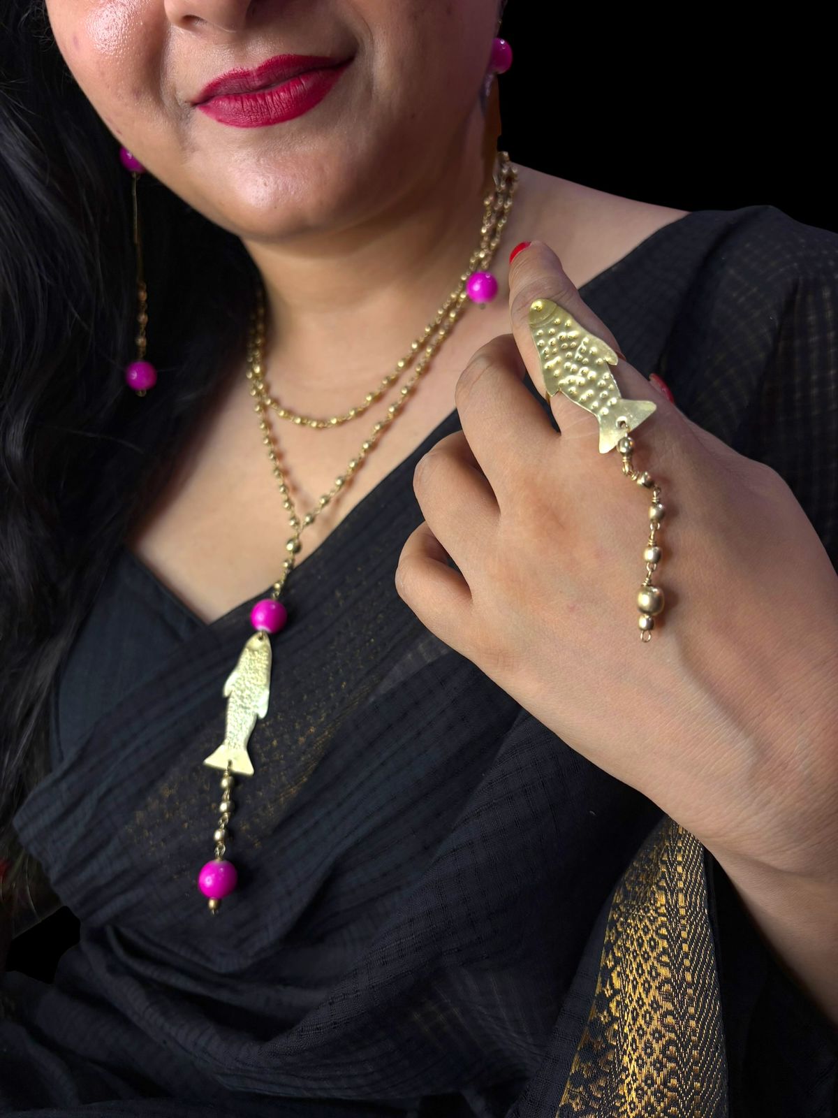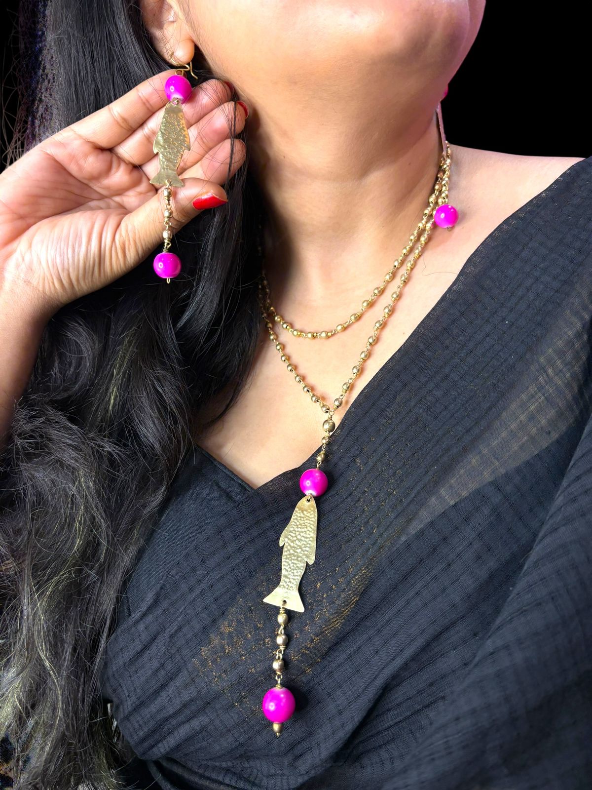 Fishy Pink Beaded Brass Pendant Necklace Jewelry Set (Necklace, Earrings, Ring)