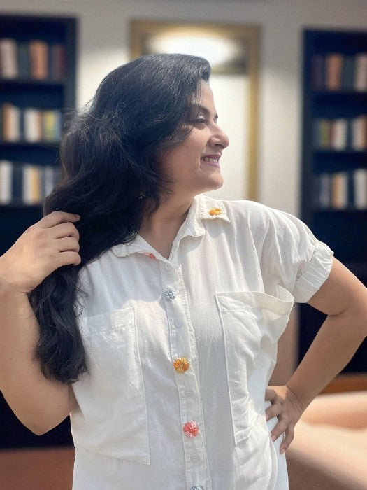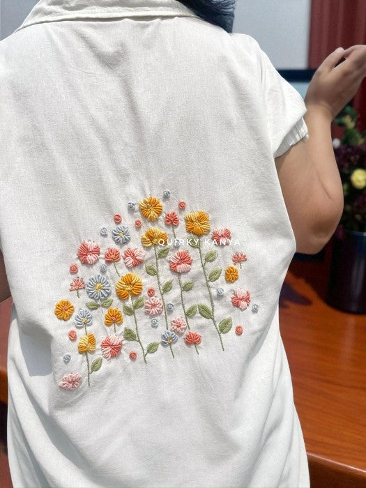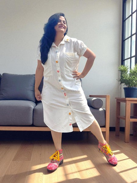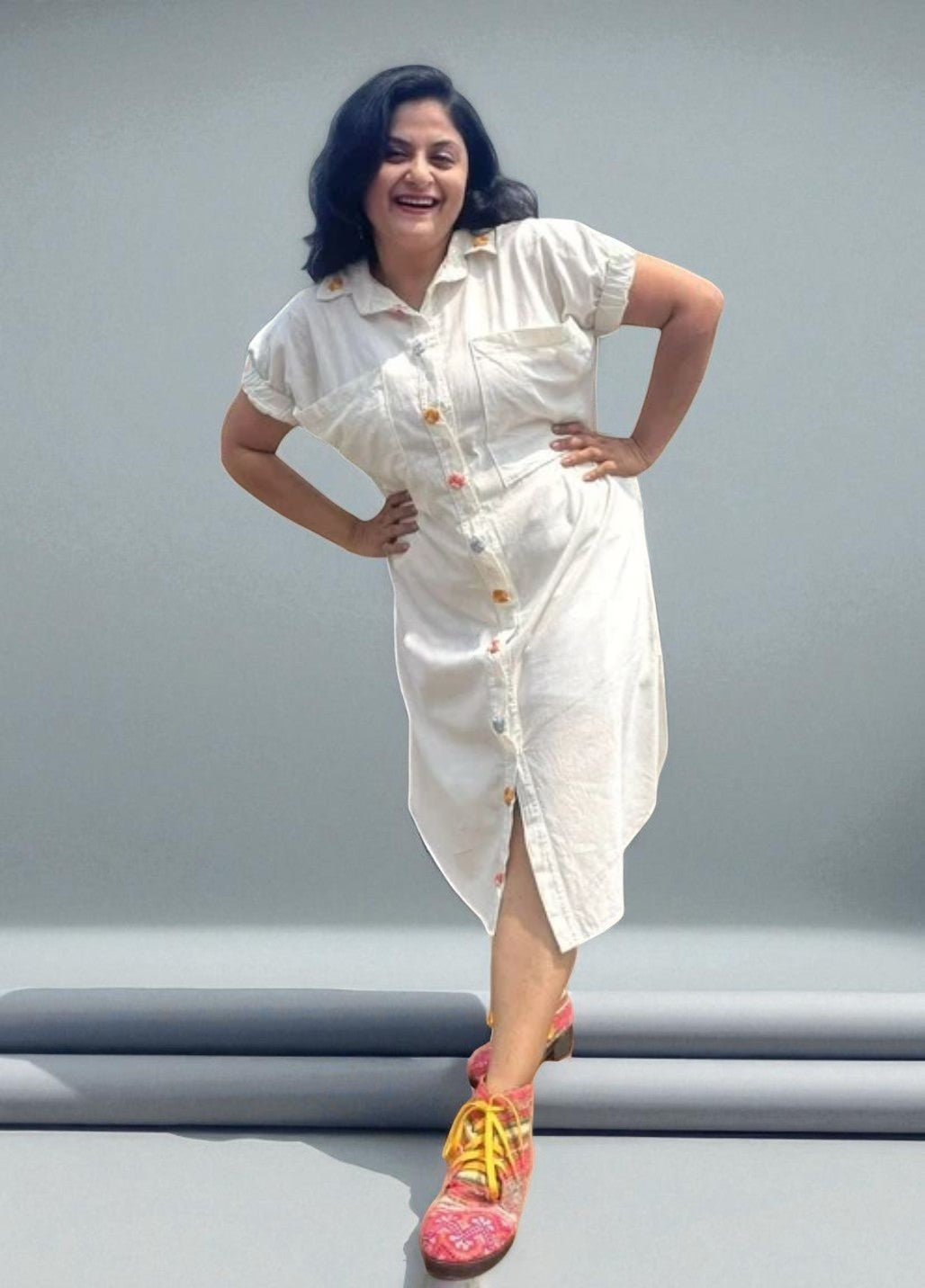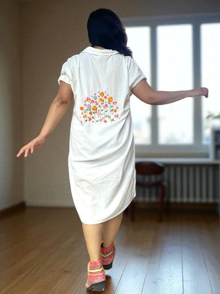Get ready to bloom in the Fleurs Embroidered Antifit Cotton Shirt Dress! This playful dress features floral hand-embroidery and a relaxed, anti-fit design for a fun and effortless style. Made with soft cotton, it offers comfort and versatility for any occasion.