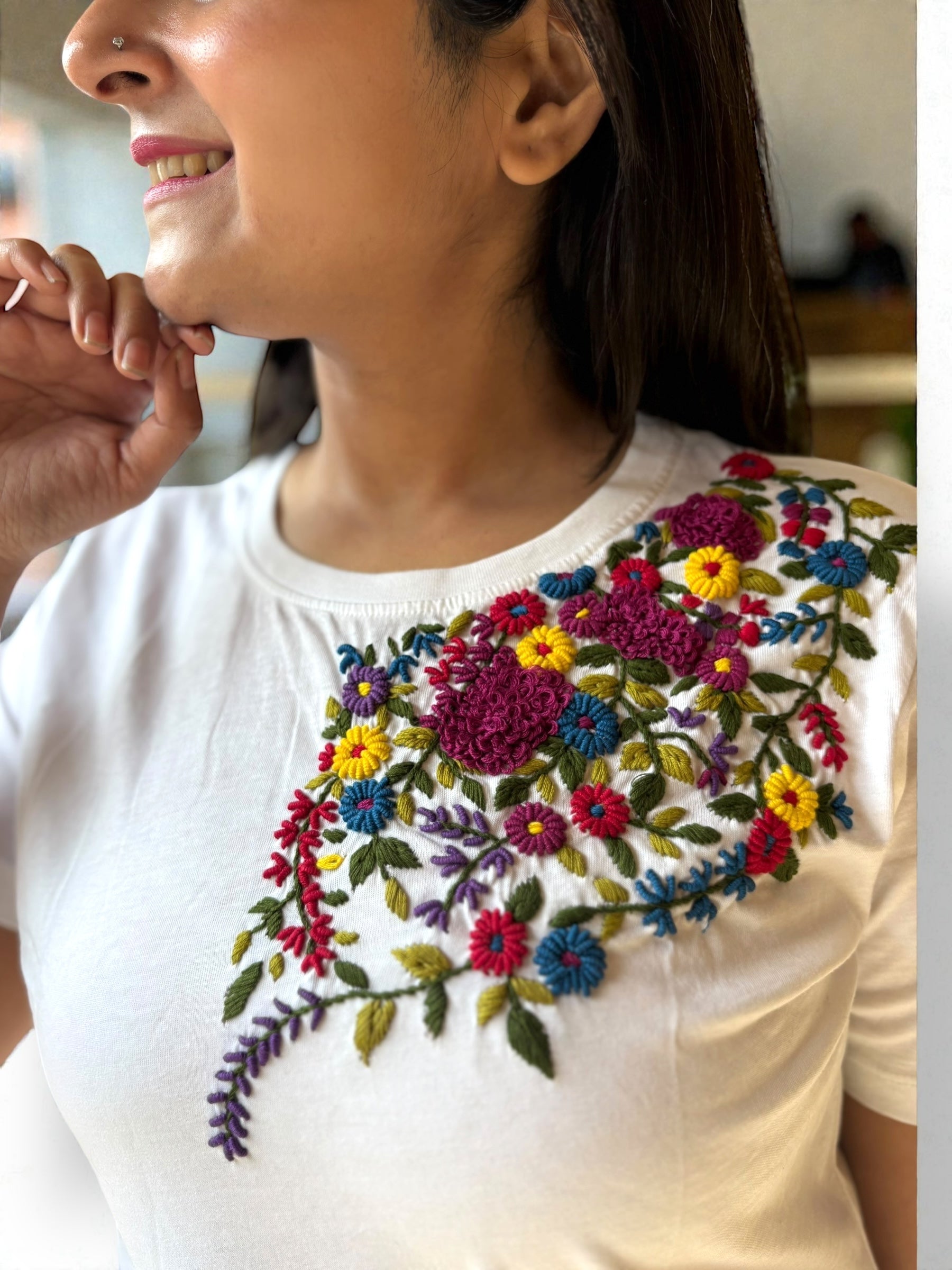 Elevate your everyday style with this charming embroidered tee featuring delicate floral details on the shoulder. Crafted for comfort and character, the Hana design brings a touch of artisan flair to your wardrobe. Perfect for casual outings or layering, this versatile piece celebrates handcrafted beauty with a playful twist. Whether you're dressing up or keeping it relaxed, this embroidered essential adds personality to any look.