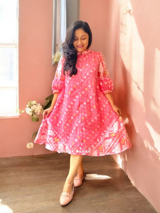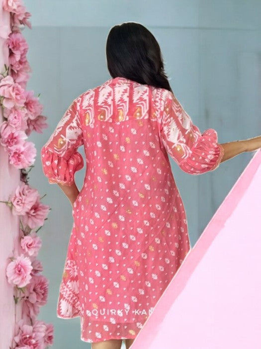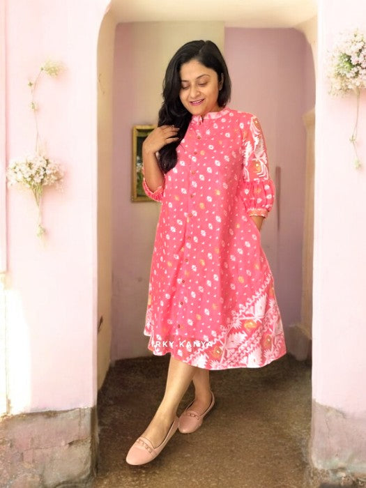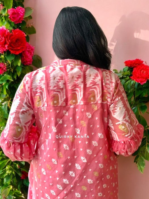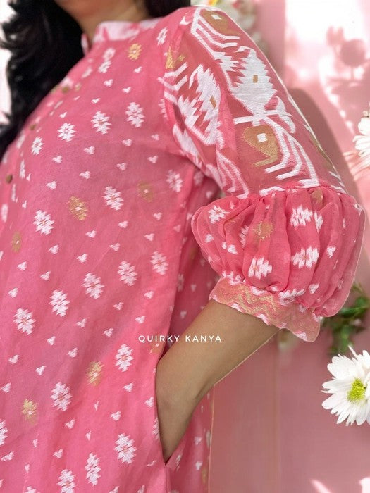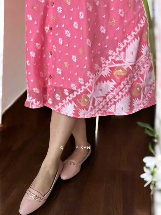 Embrace a touch of luxury with the Joie Jamdani Cotton Shirt Dress. Made with soft, breathable jamdani cotton in a beautiful peach hue, this anti-fit shirt dress is both elegant and comfortable. The intricate jamdani weave adds a unique, artisanal touch, making it a must-have for any fashion-forward wardrobe.