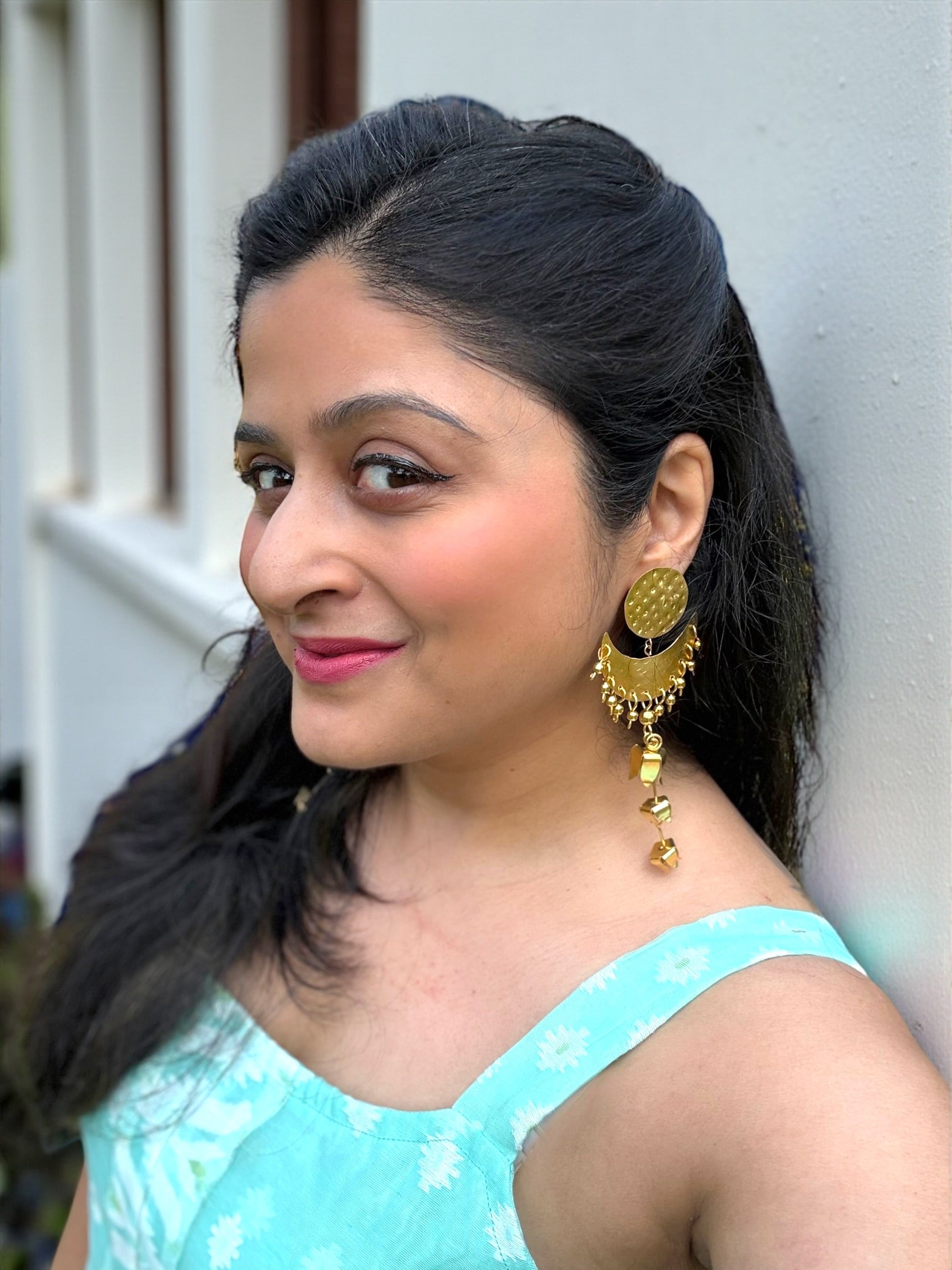 Elevate your ensemble with our Mo on Flower Brass Statement Dangler Earrings. These artfully crafted pieces feature an elegant crescent moon motif with jhumkolata flower chandelier rendered in premium brass topped with fine crystals. The sophisticated danglers create a captivating movement that catches the light with every gesture, making them the perfect accent for both formal occasions and refined everyday wear.