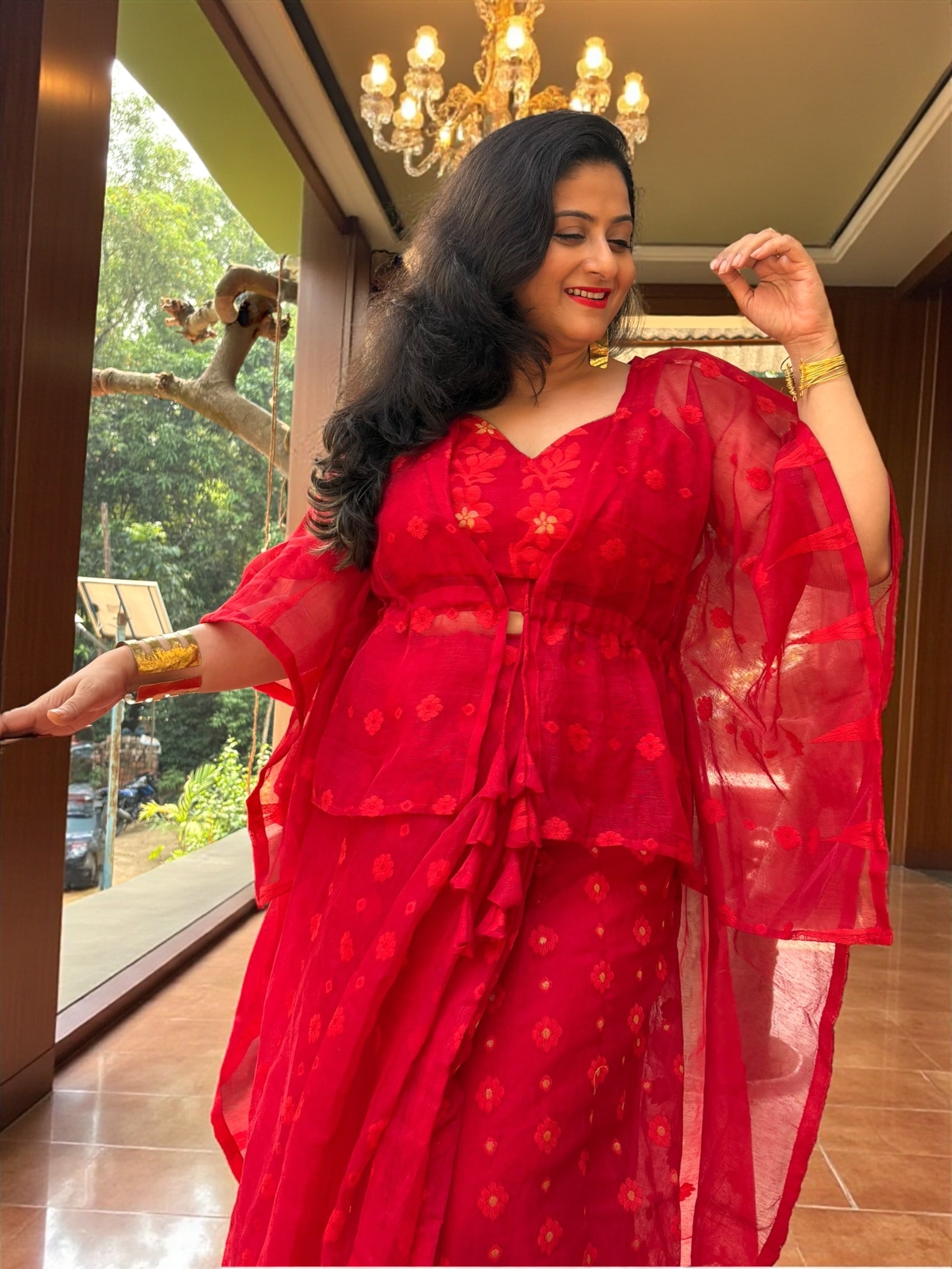 Rose Jamdani Saree Skirt, Kaftan Jacket & Top Coord Set