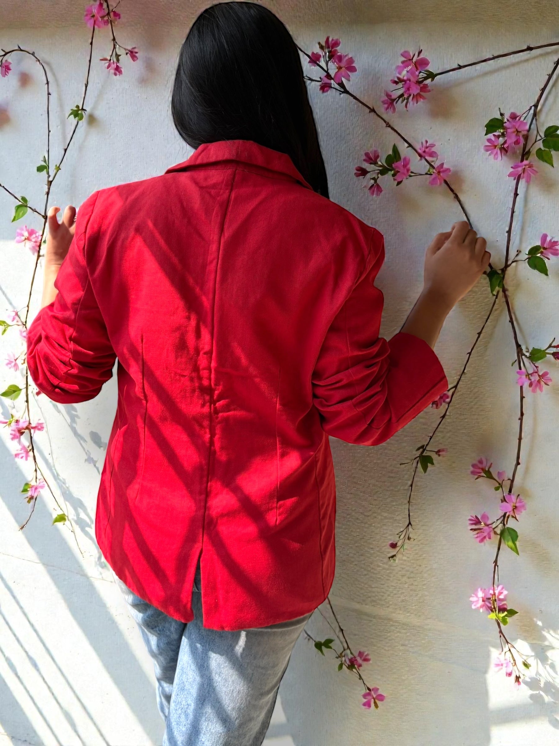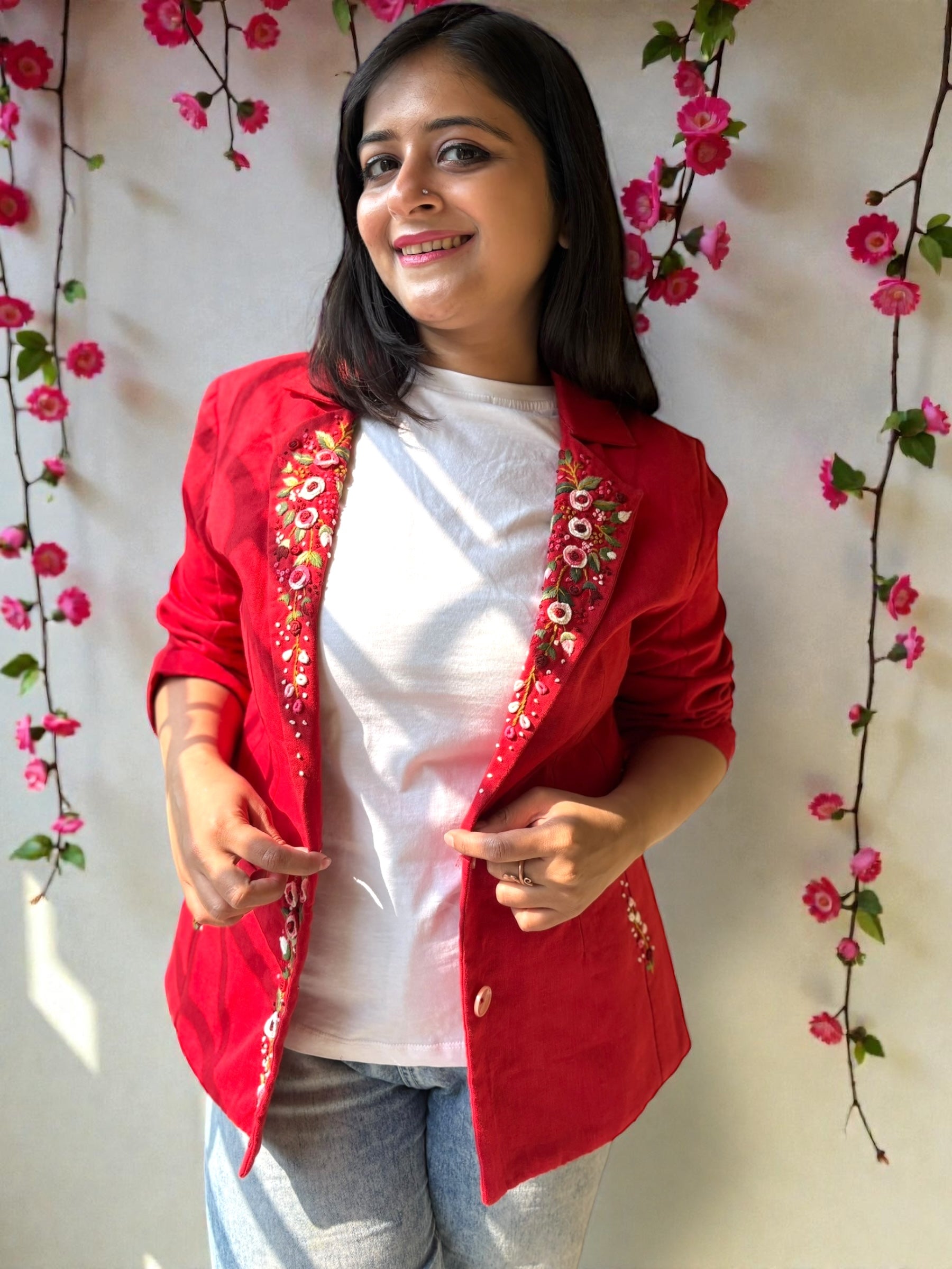 The Thea Hand-Embroidered Cotton Jacket in striking red combines traditional craftsmanship with contemporary elegance. Each piece features intricate hand-embroidered detailing that showcases artisanal skill and attention to detail. Crafted from premium cotton, this jacket offers breathable comfort while maintaining a refined silhouette perfect for layering. The vibrant red hue makes a bold statement, whether styled casually or dressed up for special occasions. A timeless investment piece that celebrates heritage craftsmanship and enduring style.